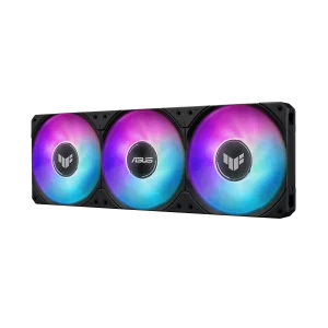 TUF Gaming LC III 360 ARGB LCD all-in-one liquid CPU cooler with pre-installed & integrated triple fans designed for high airflow and static pressure; 2.8″ LCD for hardware monitoring, custom GIFs and MP4 video clips
