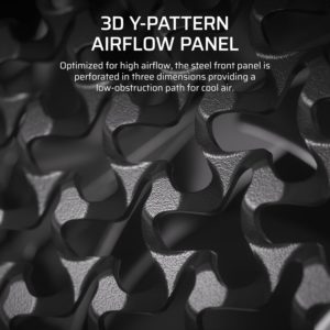 - 3D Y-Pattern Airflow Panel – Optimized for high airflow and minimal restriction, the steel front panel is perforated in three dimensions with a Y-pattern that provides a low-obstruction path for cool air
